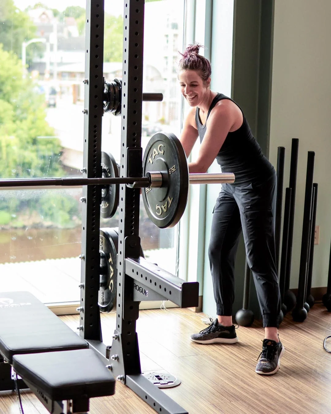 Free weights such as Rogue squat rack, weight plates, dumbbells, kettlebells, variety of bars (curl, short olympic, trap), landmine, and adjustable benches